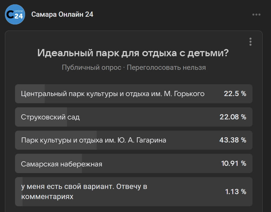 Редакция Самара онлайн 24 задала этот вопрос читателям. По итогам подсчёта голосов лидером стал Парк имени Гагарина — он уверенно обошёл Загородный парк и Струковский, заняв первое место в рейтинге.